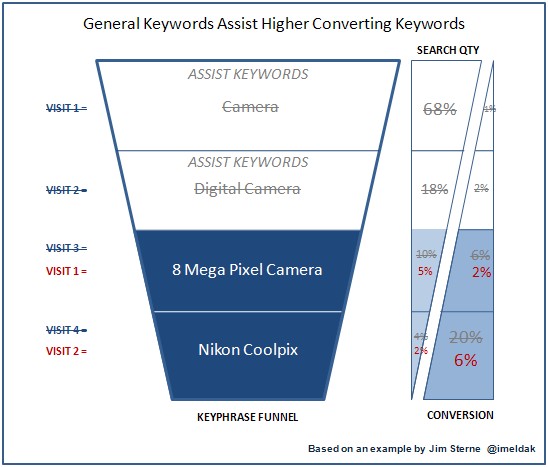 My eyes were first opened to the concept of assist attribution in a talk given by Jim Sterne at SES San Jose. The idea is that although general keywords used at the start of the customer journey have a low conversion rate, they can actually assist higher converting keywords further down the keyword funnel. Therefore, by removing assist keywords, you reduce conversion of your higher performing keywords later on.