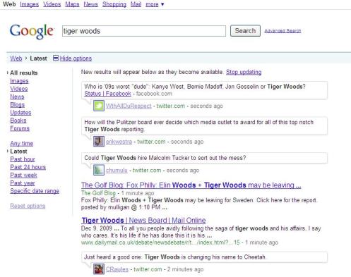 Google’s Real-Time Search results sit in the middle of the SERP and automatically flow as new information comes in, mainly from Twitter (though it also includes results from Google News, Google Blog Search, Friend Feed updates and others). Alternatively, you can also click on “Show options” and “Latest” to see a page just with real-time results. Here’s what it looks like: