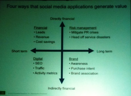 However, the one slide that stuck with me, was a quadrant diagram showing four ways that social media can generate value:
