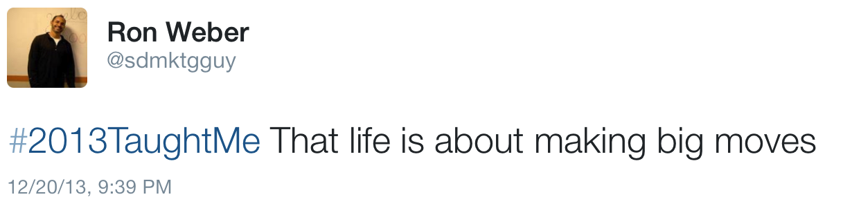 I couldn’t have said it any better than my Twitter pal, @sdmktgguy. Regardless of what the future holds, 2013 will always be a memorable year for me. It was the year that I left my first employer of 14 years, to work for a different company, in a different state, in a different industry. And despite all of the scariness that change can bring, I’ve never felt more excited and eager to make a difference.