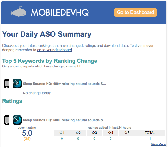 Having dabbled a little in ASO, I’ve found MobileDevHQ to be a pretty handy tool when it comes to keyword app store discovery and ongoing monitoring. Their helpful dashboards and summary emails cover things such as: Top 5 keywords by ranking change, ratings added in the last 24 hours, and actual app downloads. With the free version of the tool, the number of keywords you are able to track are unlimited and you can access up to three months of historical data.