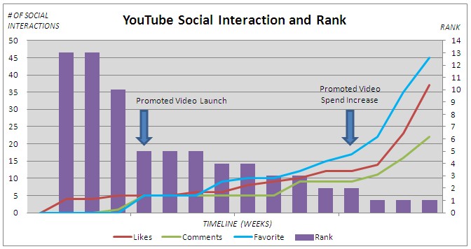 As a test case, a video was uploaded to YouTube that applied video SEO elements for a popular keyword query, with a history of strong conversion. Over the space of four weeks, the YouTube video held a steady page two position, within the organic video results. A targeted YouTube promoted video campaign was launched and within a matter of days the video increased from a rank of 10 to a rank of five. As the promoted video campaign drove more views from interested viewers, there was an increase in the video getting liked, commented on and favorited. Each time a jump occurred in likes/comments/favorites, there was a corresponding increase in rank.